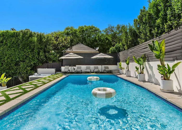 Eine komplette Küche sowie ein Essbereich im Freien stehen Selbstversorgern zur Verfügung. Die Villa in Los Angeles liegt in ungefähr 1 km Entfernung vom Restaurant Ivory on Sunset und bietet Gerichte der amerikanischen Küche. Die nächstgelegene Bushaltestelle Sunset & Miller befindet sich gleich neben dieser Villa. Diese Unterkunft in Los Angeles verfügt über einen Whirlpool zur Entspannung. Grillanlagen und Gärten sorgen für Unterhaltung.